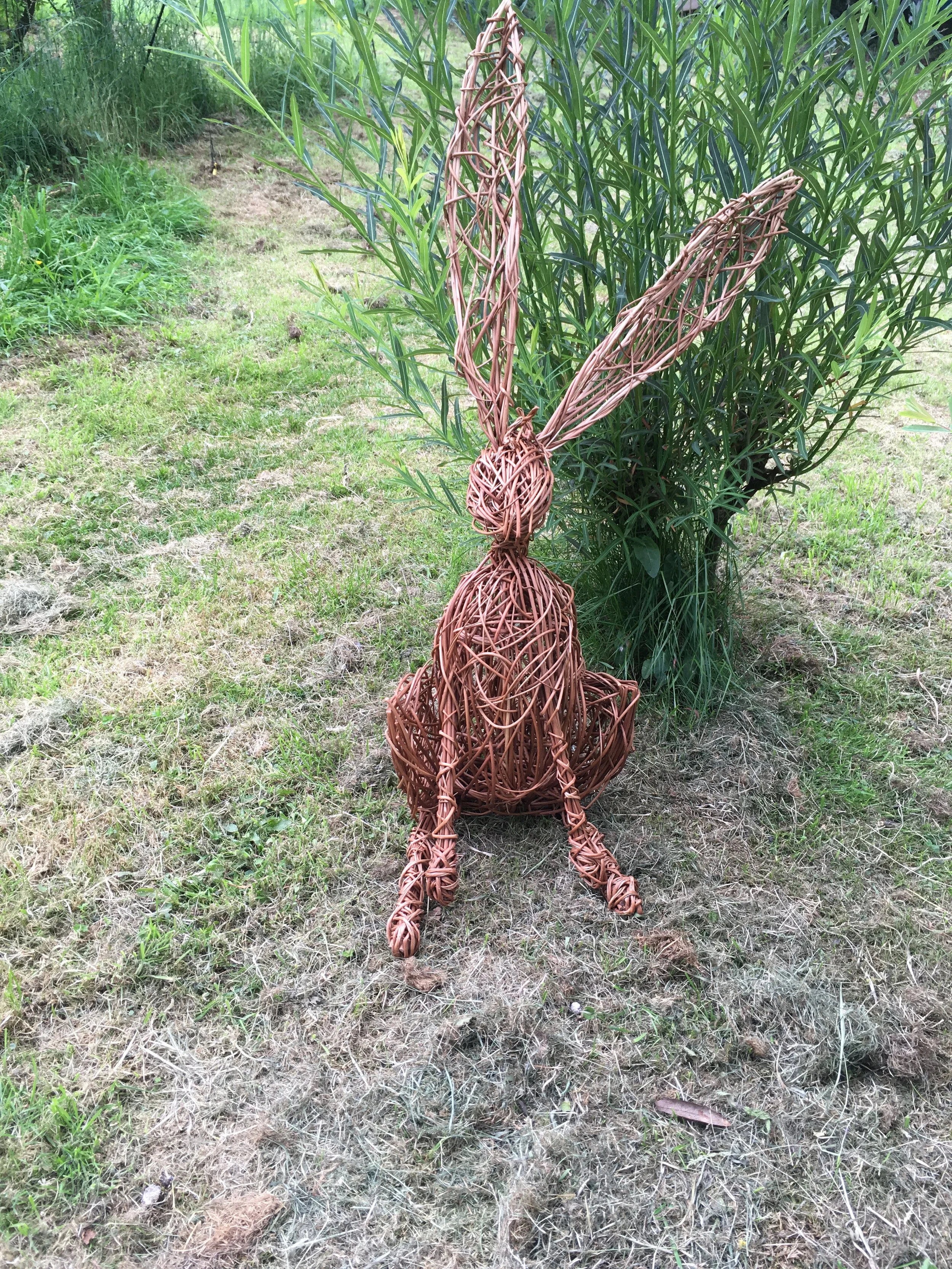 A sitting hare worked on a frame and randomly woven with locally grown willow. All tools provided and no previous experience required. The workshop is set amongst the growing willow overlooking the Dart Valley - A day spent weaving in a stress free environment!
